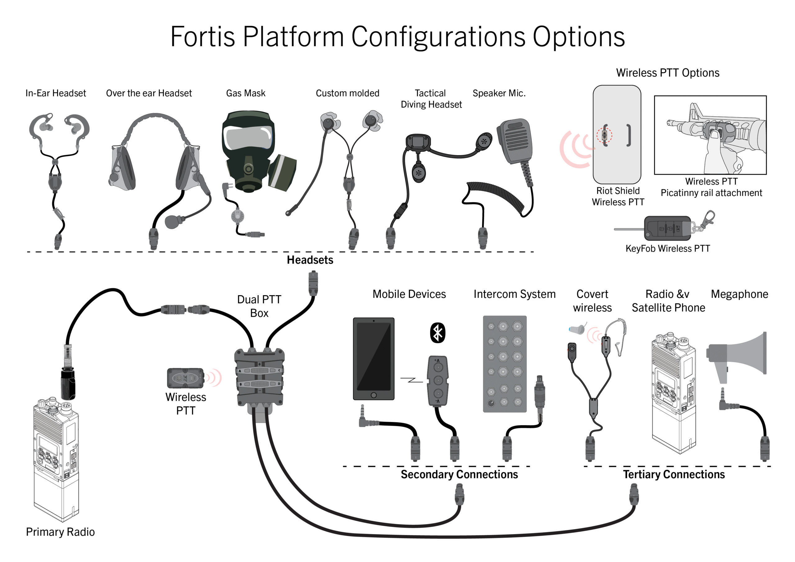 With an extensive range of interchangeable radio cable adapters, the Fortis seamlessly integrates with virtually any tactical radio—ensuring complete mission adaptability.